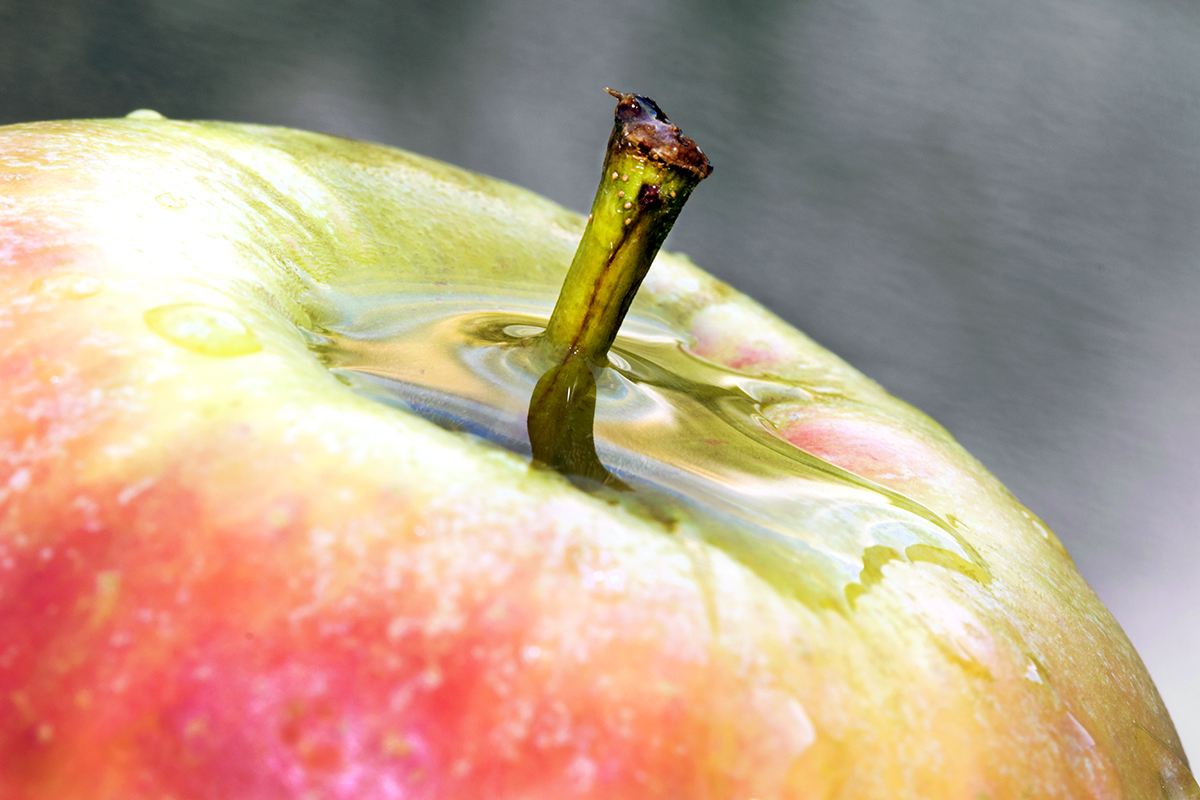 De maker geeft zelf al aan de appel eerst te hebben afgespoeld, waarna de foto vervolgens buiten met een macrolens is gemaakt. Het diafragma is f1/16 in combinatie met een belichtingstijd van 1/6 seconde. Er is scherp gesteld op het steeltje van de appel.