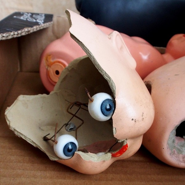 Op de foto zien we een kapot poppenhoofd, met binnenin de ogen en het daaraan verbonden mechanisme waarmee de ogen heen en weer kunnen bewegen. Erachter ligt nog een deel van een andere pop. De stukken bevinden zich in een kartonnen doos. De voorste pop lijkt van een soort porselein te zijn, te zien aan de randen. Bij de achterste pop is dat at moeilijker te zien.