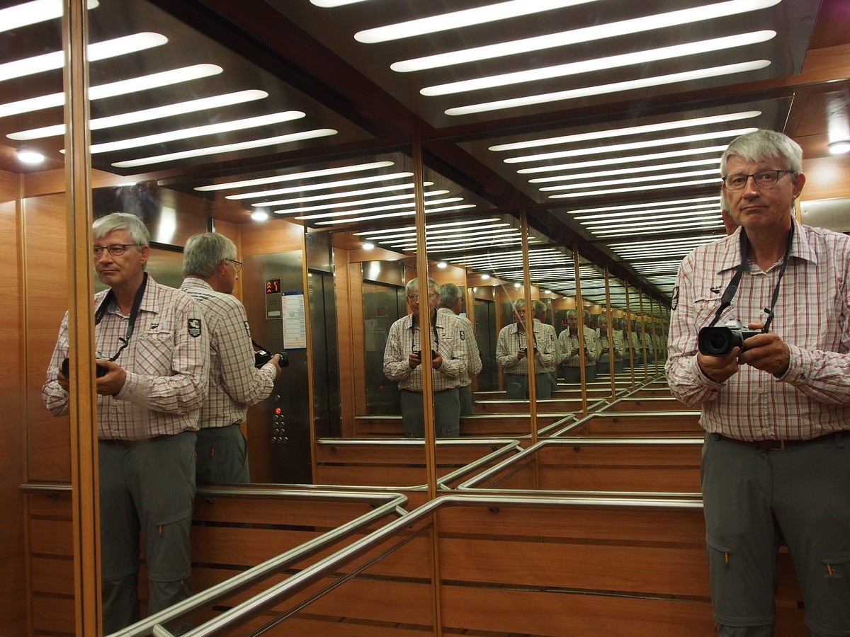 Op weg naar Engeland met de boot van Hoek van Holland. De liften zijn aan de binnenzijde rondom voorzien van spiegels. Na een paar “ritjes” had ik de lift voor mijzelf en kon ik deze foto maken.