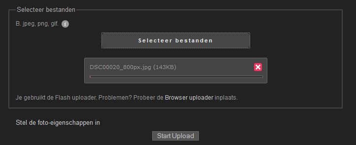 Belangrijk: de maximale grootte voor de foto’s is ingesteld op 1200 px (langste zijde). Een kleiner formaat wordt niet aangepast, een groter formaat wordt wél automatisch aangepast aan het max. toegestane formaat. Het programma past niet de bestandsgrootte aan. Het is dus belangrijk dat je een extern programma (Photoshop, Elements, Photoresize o.i.d.) gebruikt om de foto’s op “webformaat” (tot ca. max 500kb) brengt.